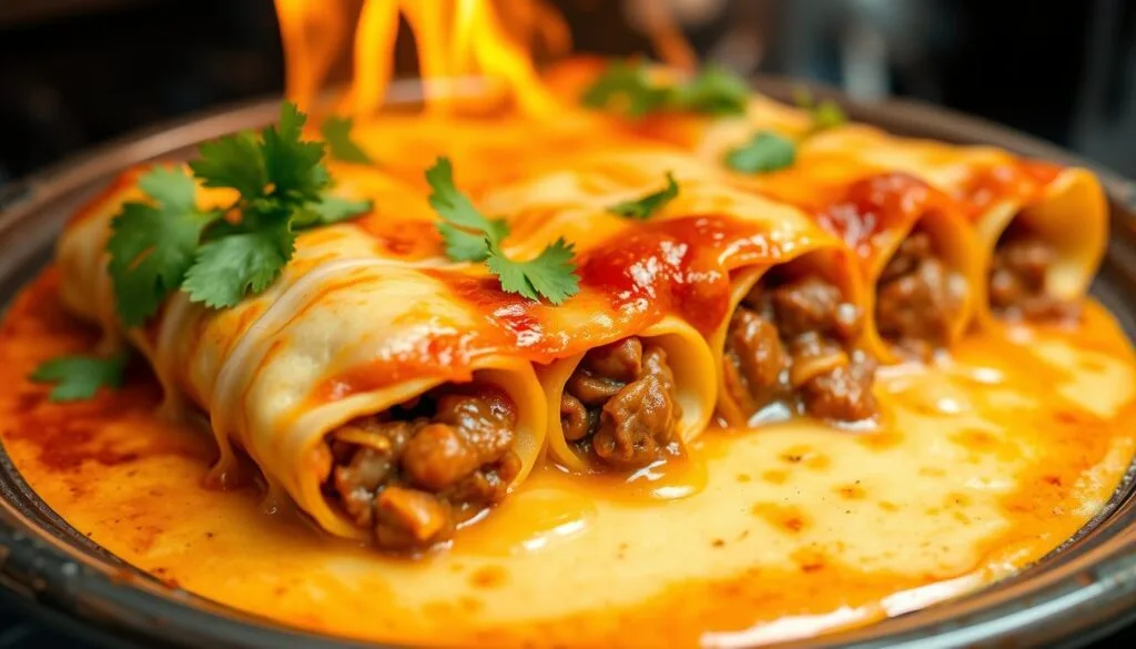 Imagine rolling tender ground beef, rich refried beans, and melted cheddar jack cheese in soft tortillas. Then, smother them with a zesty homemade enchilada sauce. This dish is more than just dinner. It’s a culinary adventure that brings Mexican flavors to your table.