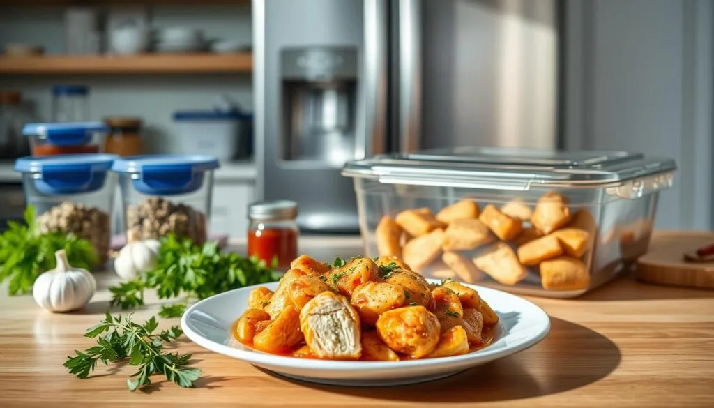 To reheat, place the chicken and sauce in separate pans over low heat. Stir the sauce now and then to avoid sticking. Check the chicken often to ensure it’s hot but not overcooked. This way, you’ll enjoy it just as much as when it was first made.