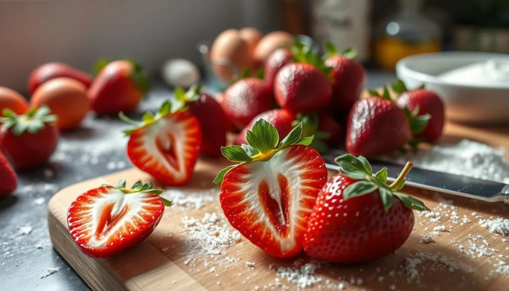To make a tasty strawberry cake using cake mix or a homemade strawberry cake, start with fresh strawberries. You’ll wash, hull, and slice them. Then, mix the sliced strawberries with sugar and flour for the right taste and texture.